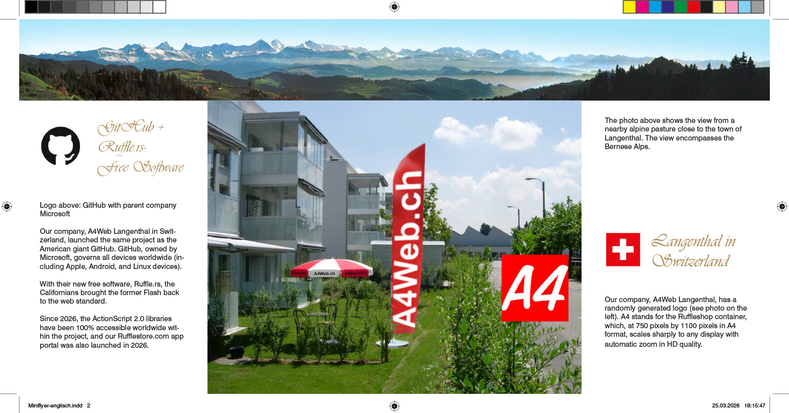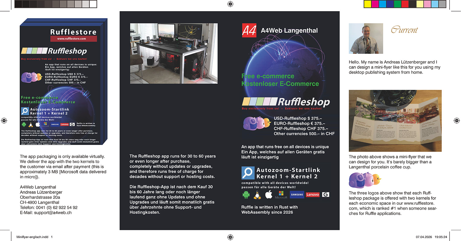 Kontakt: A4Web Werbeagentur Langenthal + Ruffle-Experte Ruffle läuft auf allen Geräten der Welt kostenlos und ohne Supportkosten! A4Web ist der günstigste Webdesign-Anbieter der Schweiz: Unser Ruffleshop (E-Commerce App auf Ruffle kostenlos laufend) läuft bei einer Mindest-Lebensdauer von 30 Jahren für sage und schreibe nur Euro/Fr. 1.04 pro Monat. Bei einer Mindest-Lebensdauer von 60 Jahren kostet der Ruffleshop nur Euro/Fr. 0.52 pro Monat. A4Web Advertising Agency Langenthal + Ruffle Expert Ruffle runs on all devices worldwide, free of charge and with no support fees! A4Web is the most affordable web design provider in Switzerland: Our Ruffleshop (an e-commerce app running on Ruffle, free of charge) runs for a minimum of 30 years for the incredibly low price of just Euro/US$ 1.04 per month. For a minimum of 60 years, the Ruffleshop costs only Euro/US$ 0.52 per month. A4Web Langenthal Andreas Lützenberger