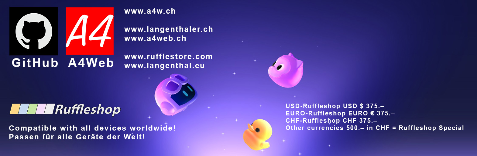 Editorial Ruffleshop jetzt kaufen: für die nächsten 30 Jahre ohne Betriebskosten Weltweiter Erfolg für www.rufflestore.com Ein Ruffleshop (unter www.langenthal.eu oder www.rufflestore.com bestellbar) kostet gerade mal eine Jahresgebühr bei einem Konkurrentenanbieter der Hostingfirmen von Fr. 375.- Einmal bezahlt, kostet dann der Ruffleshop gar nichts mehr. Auch kein Abo oder keine Folgekosten entstehen mehr. Auch keine Updates und keine Upgrades fallen an. Der schnell auslieferbare Ruffleshop ist in fünf hellen Farben zur Zeit erhältlich, welche 1:1 zur Generation 11 iPad und iPhone17 passen. Helle Farben sind besser lesbar. Da die schwarze Schrift auf hellem Farbhintergrund gut leserlich ist. Eine Farbe ist notwendig, da das Computerweiss gebrochen werden muss wegen Augenschäden. Wenn jemand keine Farbe will, kann er auch das Hellgrau wählen. Die Computerschrift wurde auf Segeo gewählt, da dieser Schriftsatz alle weltweiten Sprachen unterstützt. So kann der Ruffleshop in allen gewünschten Währungen angeboten werden. Beim Bestell-Doppelbutton werden zwei Warenkorb-Einsendungen parallel gleichzeitig erlaubt. Der Encrypted-Send-Button und der E-Mail Button. Der Encrypted-Send-Button sendet der Warenkorb schön formatiert und komplett mit hunderten Artikeln zurück durch die GPU direkt durch jede Firewall also zurück zum Hosting in einem encrypted Kanal in ein geheimes verschüsseltes PHP-Skript. In den angebotenen fünf Farben kann so ein günstiger Ruffleshop weltweit schnell ausgeliefert werden. Geben Sie uns einfach Ihre URL an. Wir senden Ihnen dann ein ZIP zu. Im ersten Kernel werden 9 Menüs zu je 250 Shopartikeln direkt im Root in einer Text-Datei eingegeben (vom Kunden selbst programmierbare Menüs). Der zweite Kernel ist die gleiche Webseite aber mit 24 Menüs, die auch im Root beschriftbar sind durch Sie selbst in Textdateien. Im ersten Kernel können 3000 Artikel abgerufen werden, im zweiten kommen 3000 Artikel hinzu, sprich bis 6000 Artikel also. Der Ruffleshop ist auch für kleine Artikelanzahl ideal. Man lässt die anderen Menüs einfach leer. Oder verteilt die Artikel auf mehrere Menüs mit je fünf Artikeln auf einem Menü. Die HTML-Version kann dann nachträglich gewählt werden, wenn der Prozessor nicht schnell genug ist. Dies sind Androide, die älter und vor 8 Jahren produziert worden sind. Dieser Ruffleshop wurde zuerst an das Kreditsystem der Schweizerischen Postfinance konzipiert. Jedoch sahen wir von einem Kreditkartenanschluss ab, da unsere Kundschaft Kleinstkunden im Privaten Bereich sind, die dann nach Warenkorbbestellungen selbst dem Kunden mailen können, wohin er zu bezahlen hat, oder im Autoresponder des geheimen PHP-Skriptes können Bankdaten dem Kunden übermittelt werden, wohin er einzubezahlen hat. Was automatisch abläuft. Dort kann man auch den Kreditkartenanbieter einprogrammieren durch den Informatiker. Zur Geräte-Hersteller-Garantie: hier klicken Andreas Lützenberger