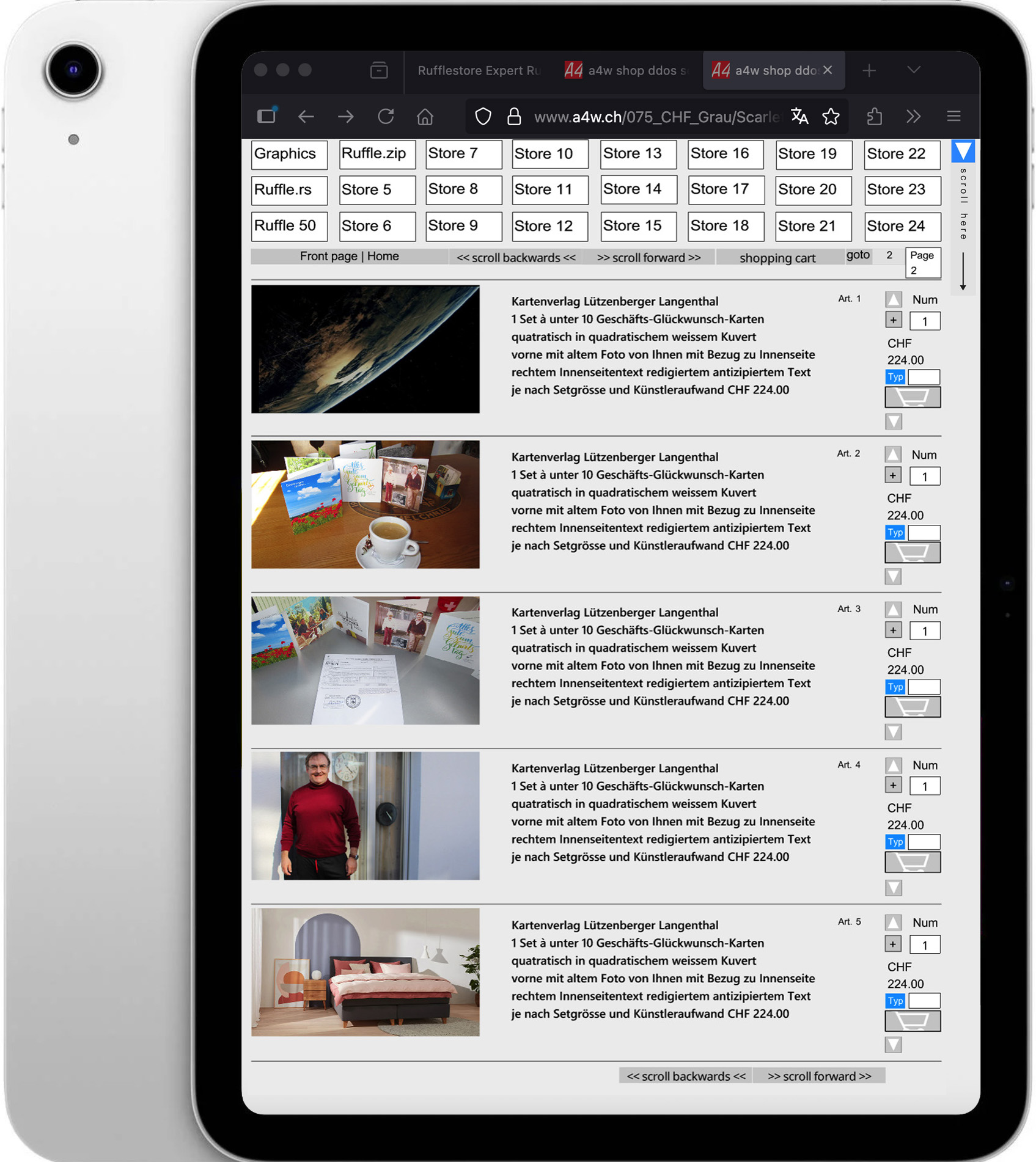 iPad 11 (2025) passt 1:1 auf den Ruffleshop. Auch das iPhone passt 1:1 auf den Ruffleshop. Dass der Ruffleshop immer passt, liegt an seiner exzellenten Container-Grösse vom 750 Pixel mal 1100 Pixel, welche mit skalierbarem Layout samt skalierbarer Beschriftung und skalierbaren Linien stets ein ausgezeichnetes scharfes Bild auf jedem Display resultiert. Links das Foto zeigt unser iPad 11 (2025) mit dem Firefox und Safari und unserem Intranetbutton (A4). Wenn man auf den Hauptbrowsern den Ruffleshop wählt, dann erscheinen überall genau die Displays 1:1 wie oben in den fünf Farben der Geräte und Ruffleshops (ebenfalls fünf Farben) abgebildet sind. Die iPhones und die iPads resultieren also ein sehr schnelles Handling mit der Ruffleshop-Software. Weiter unten (bitte nach unten scrollen) sind die Links zu den Ruffleshops in allen Farben als Muster abrufbar und Sie dürfen so einen Shop mit Warenkorbbestellung selbst testen weiter unten. Es löst keine Bestellung bei uns aus. Ruffleshop USD € CHF 375.- Ruffleshop Germany Gold and Starlight / Himmelblau and Blue / Rasengrün and Space Grey / Lippen Rosa and Purple / Grau and Silber Am Schluss soll es dann einfach schön aussehen. Ein Ruffleshop ist hochauflösend immer scharf und sieht stets gut aus. Besonders auf den neuen iPad-Serien von Apple passt diese Shopsoftware wie massgeschneidert auf das Display. Kaufen Sie so ein iPad wie oben abgebildet und bei uns einen Ruffleshop für nur Fr. 375.- (dann keine Kosten mehr 30 Jahre lang, also ohne Betriebskosten minus Fr. 10800.- |