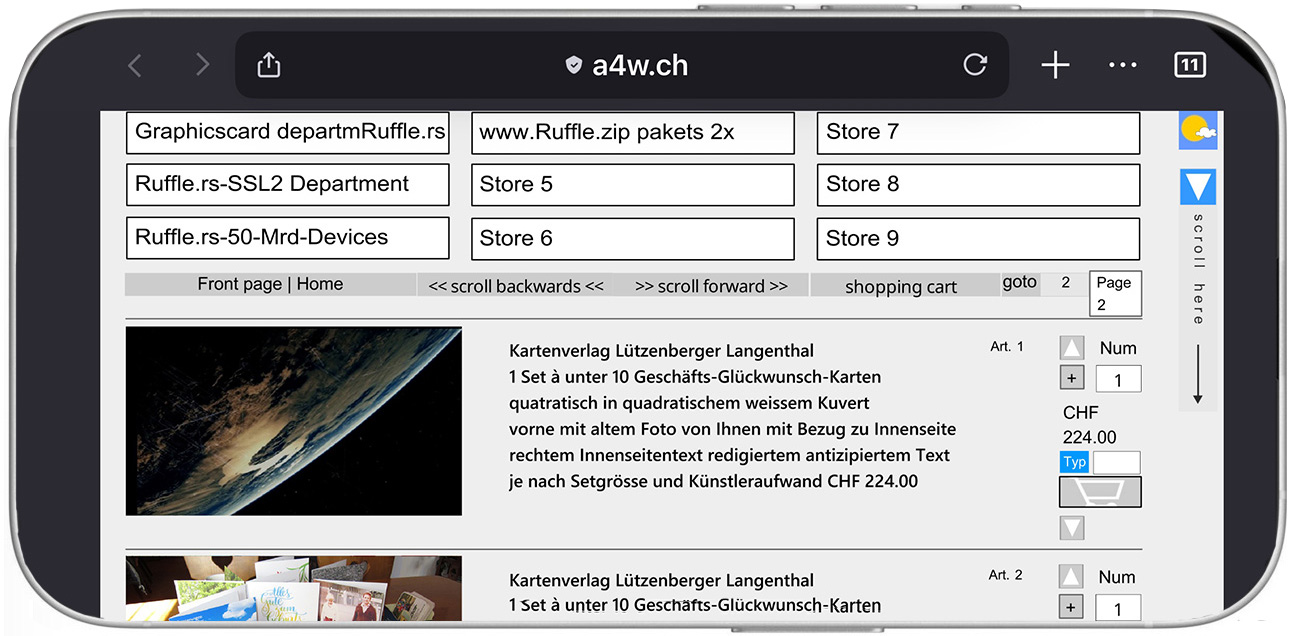 Ruffleshop's perfect fit is due to its excellent container size of 750 pixels by 1100 pixels, which, combined with a scalable layout including scalable text and lines, always results in a perfectly sharp image on any display. In addition to the two kernels we deliver with every Ruffleshop purchase for CHF/USD/EUR 375, we've also included two Full HD start files. These files prevent the Ruffleshop from being displayed horizontally when held in landscape mode, but when smartphones and tablets are held vertically, Ruffleshop will automatically fill the screen to 100% width and 100% height, in full HD quality. Rustleshop enthusiasts can then directly select these start files with automatic zoom as their shop's start file when linking them to launch Ruffleshop. It has the extension ~-full.php in the firmware. This means both kernels can be started directly without scrolling functionality. The autozoom startup file might be the right starting point for Flash or Android fans. However, the browser's zoom function, like holding the smartphone horizontally to zoom in, is no longer possible; that's also no longer an option. The autozoom start file can be found in the Ruffleshop-Testing on the right-hand side at the top, using the magnifying glass function |